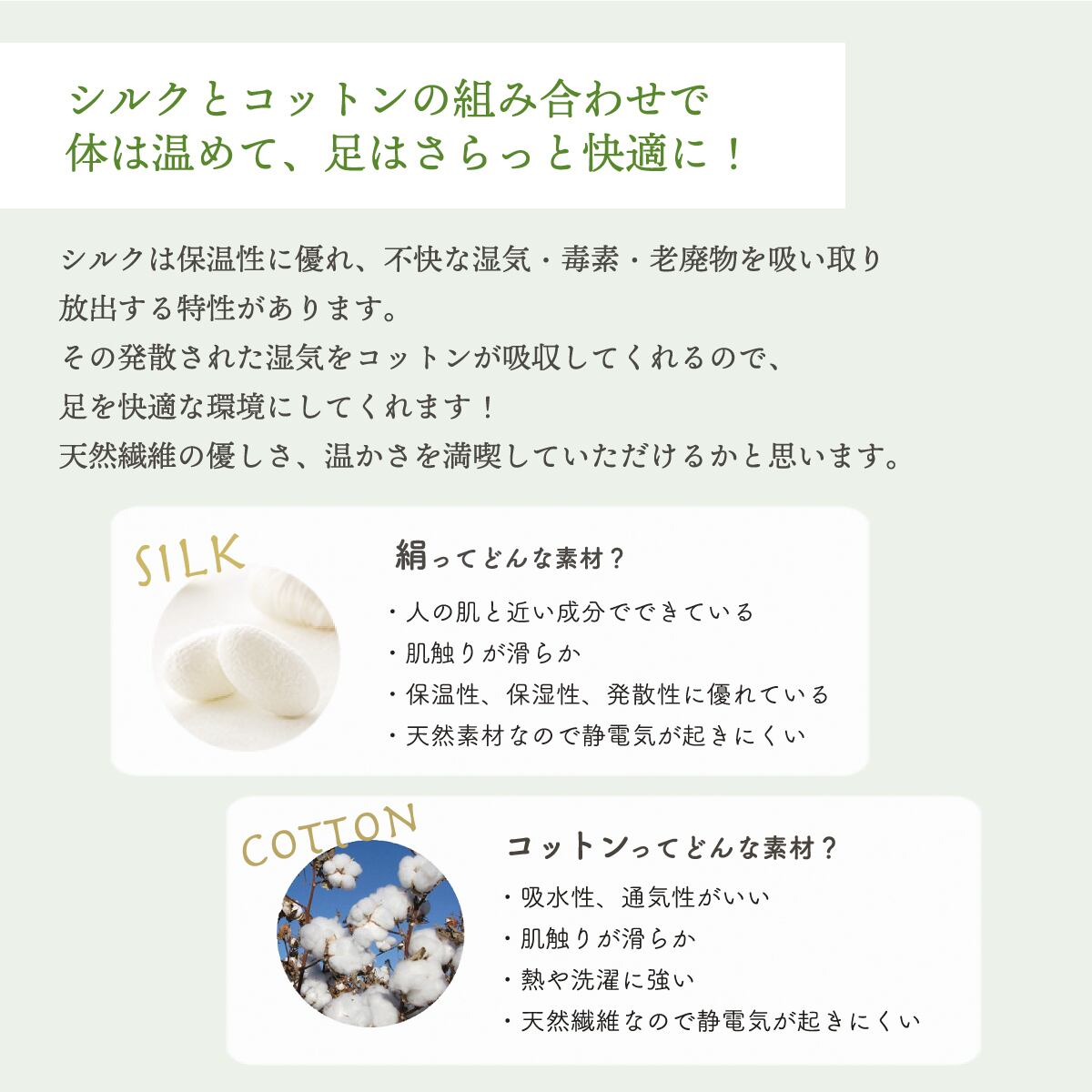 こちらの商品の素材は、肌に当たる内側にワイルドシルク、外側にオーガニックコットンを使用しており、素材としては最高級の靴下です!