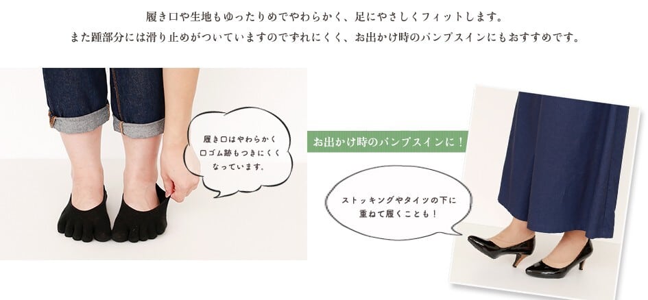 パンプスインだけでなく、タイツの中などにも履いていただけますので、足先のムレ対策としても活躍してくれます。