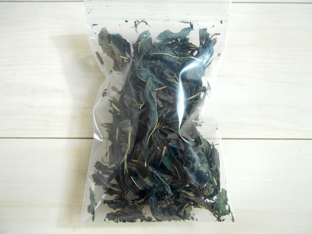 藍の乾燥葉は、機械で乾燥するとすぐに湿気て品質が悪くなりますが、こちらは手間暇かけて天日で完全に乾燥させた葉ですので、よほど湿度の高い場所で保存しない限り劣化しにくく、最後まで様々な用途に使えます。