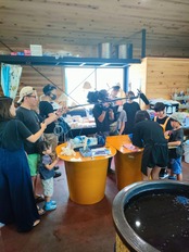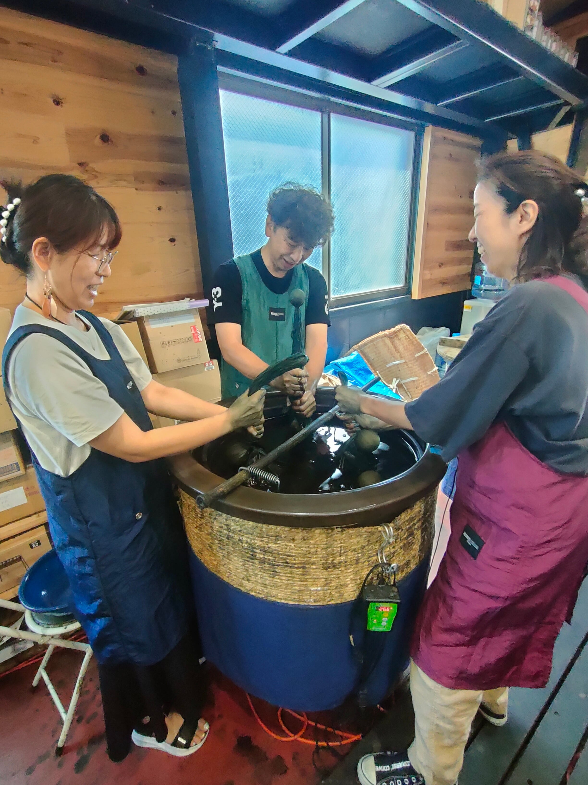弊社の藍染め体験は、化学物質は一切使用せず、オーガニック蒅(すくも)を使用し、江戸時代から続く技法である「灰汁醗酵建て」技法で建てた染め液で藍染めを体験していただきます。