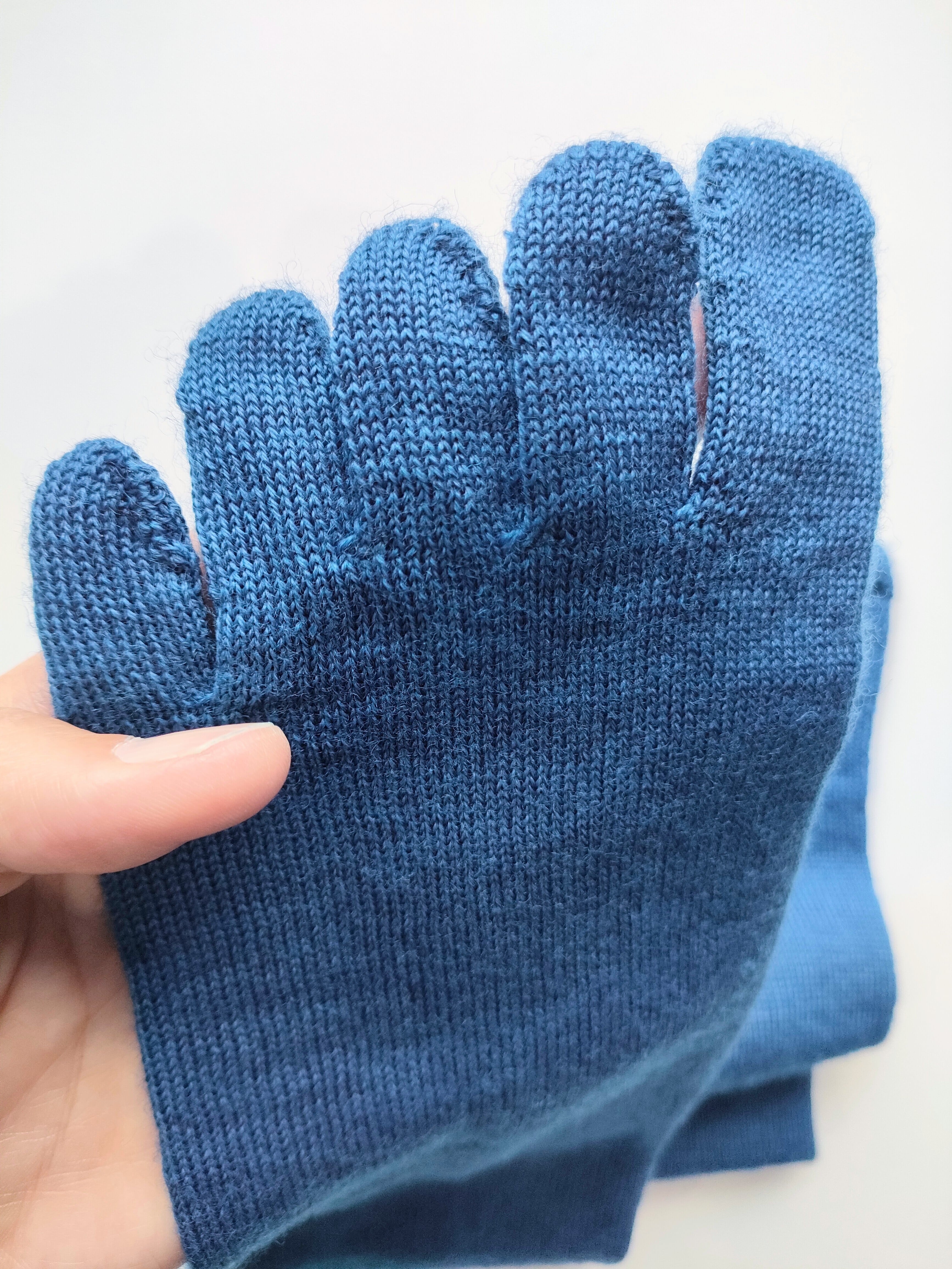 シルク&ウール5本指靴下より薄めではございますが、ウールの良さを残すために、オーガニックコットンのリラックス5本指靴下ほどは薄くなっておりません。