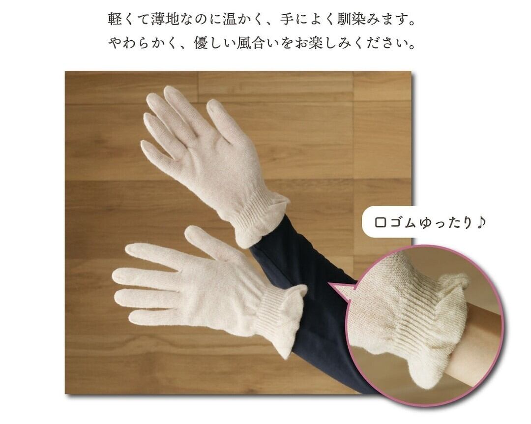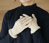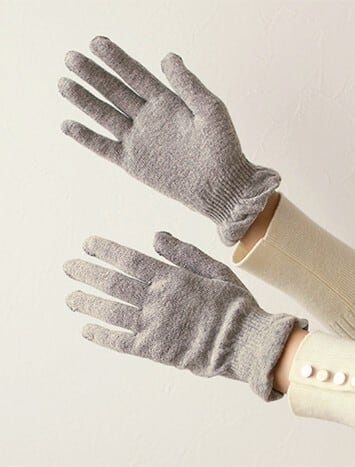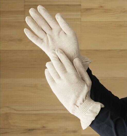こちらの手袋は、カシミヤに匹敵する超極細のウールを使用しているため、特徴として毛玉ができにくく、さらに内側をシルクで編み上げましたので、肌にもとても優しい手袋となっております。