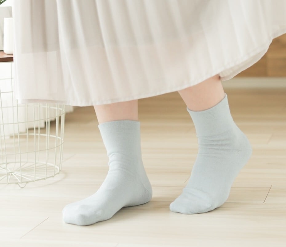 足口はゴムは使用しておらず、伸縮する弾性糸が入っておりますので、締め付け感は感じにくいのにずれ落ちにくくちゃんと立ち、優しく足を包んでくれます。