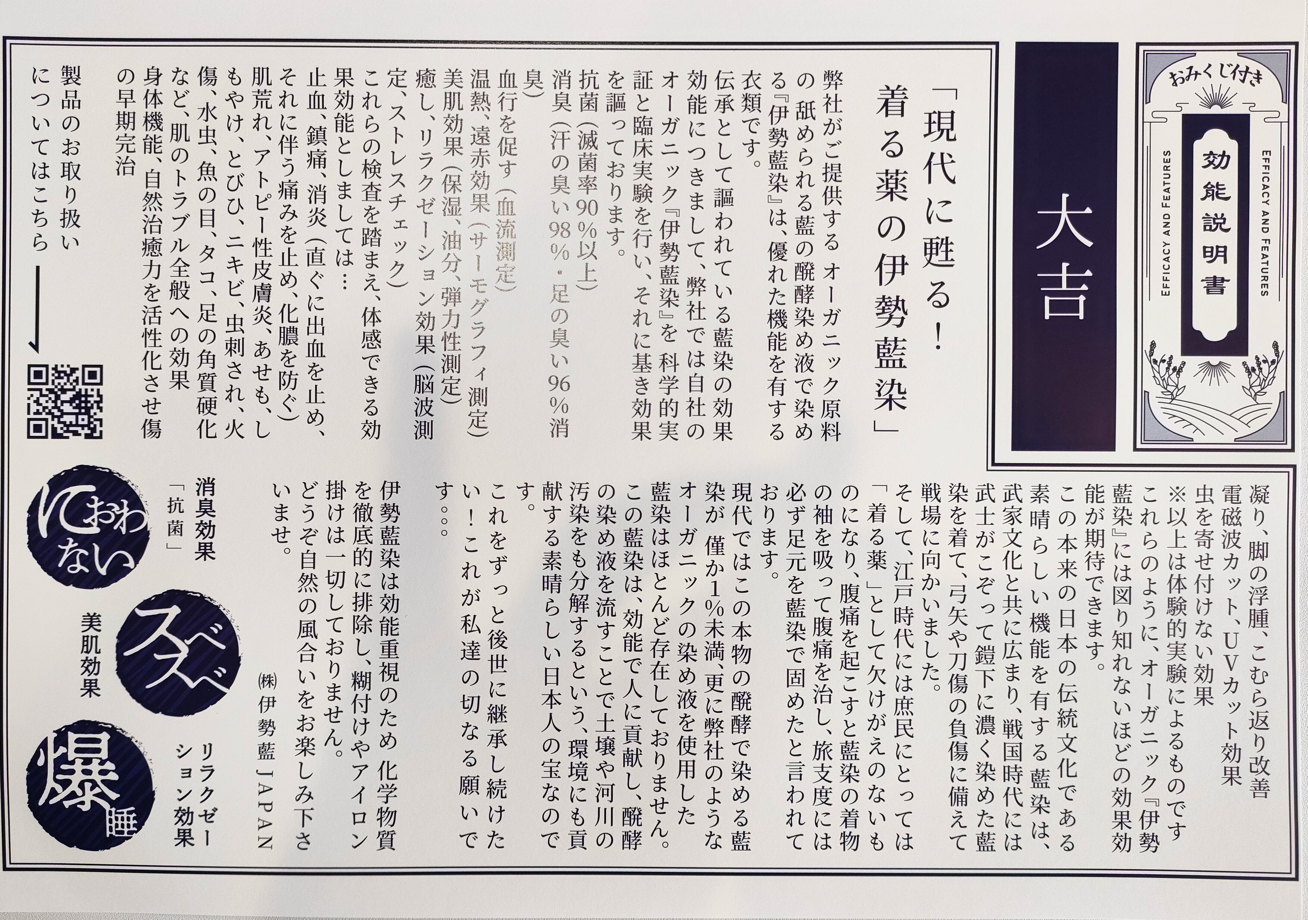 また伊勢藍染には身体を緩め、自然治癒力を高めるという効果があり、痛みの鎮静、脚の浮腫み緩和、美肌等々、他にも数えきれないほどの体感できる効果がプラスされます。