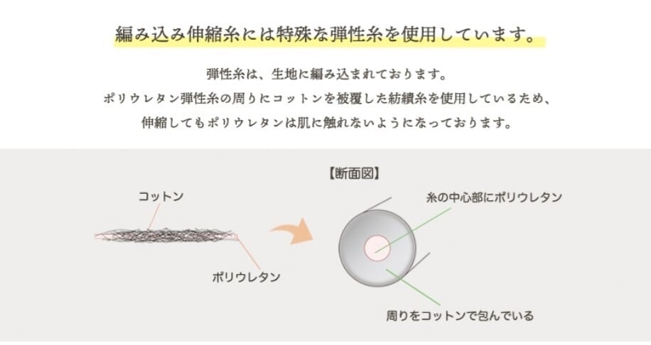 ※混紡糸を使用。編みこみ伸縮糸はコットンに包まれており、肌に触れないよう編み上げています。